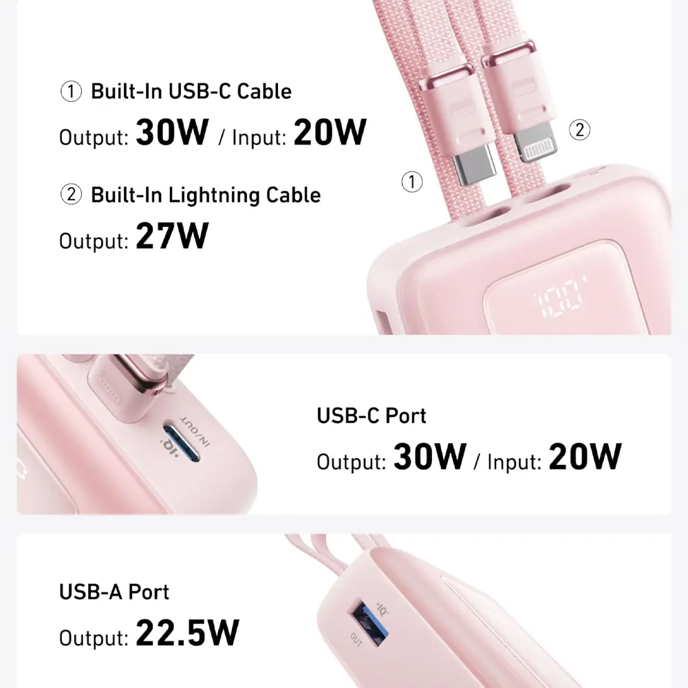 - پورتها: دو کابل داخلی (لایتنینگ MFi و USB-C)، یک پورت USB-C و یک پورت USB-A.
