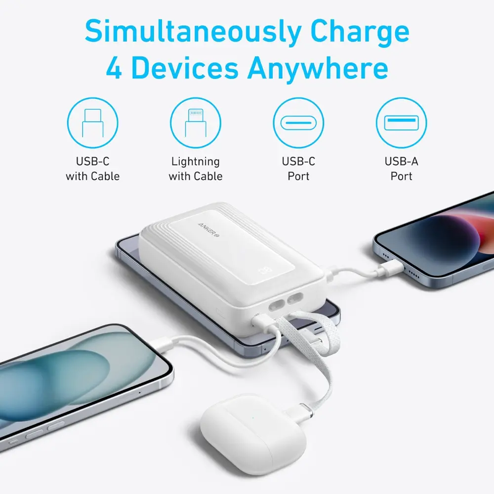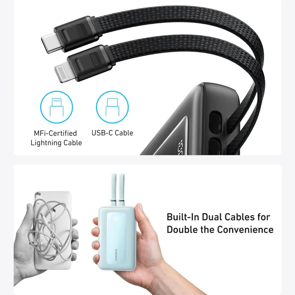 پاوربانک انکر Zolo مدل A1681 یک ایستگاه شارژ All-in-One است که استقلال کامل انرژی را برای دستگاههای متعدد فراهم میکند. ویژگی کلیدی و رقابتی این مدل، تعبیه دو کابل داخلی است: کابل لایتنینگ (MFi Certified Lightning) برای محصولات اپل و کابل USB-C برای دستگاههای اندروید و سایر گجتها. این کابلها با بافت ۴۸ رشتهای، مقاومت فوقالعادهای در برابر بیش از ۱۰,۰۰۰ بار خمش دارند که دوام و کیفیت ساخت این محصول را تضمین میکند. ظرفیت این دستگاه، به طور تقریبی ۴ بار شارژ کامل برای آیفون ۱۵ پرو و نزدیک به ۳.۸ بار شارژ کامل برای سامسونگ S24 را فراهم میآورد.