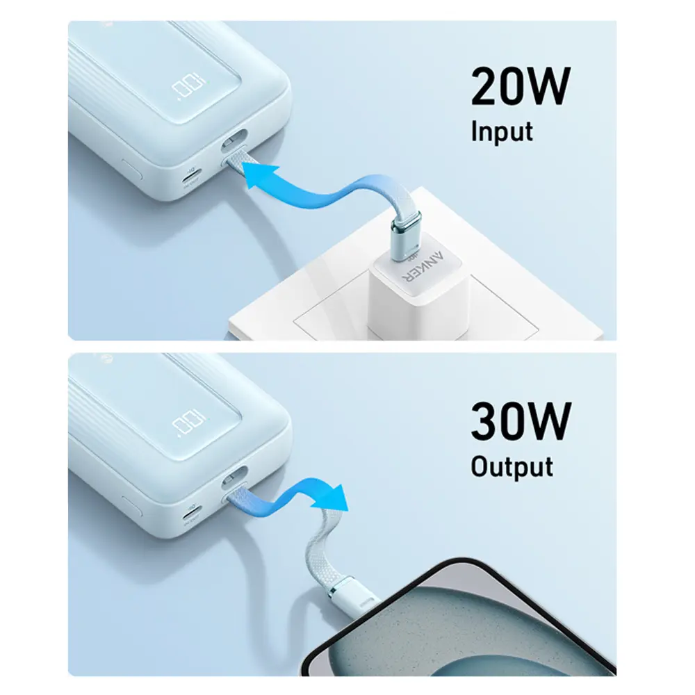 این پاوربانک به خروجی 30 وات و فناوری شارژ سریع PD 30 وات مجهز شده است که سرعت شارژ را بهطور قابل توجهی افزایش میدهد و آن را در میان پاوربانکهای رقیب متمایز میکند. به عنوان مثال، شارژ کردن یک گوشی سازگار تا ۵۰ درصد ظرفیت باتری در حدود ۳۰ دقیقه، یا تأمین برق مورد نیاز لپتاپهای کممصرف، نشاندهنده عملکرد حرفهای این دستگاه است. این ویژگی بهطور خاص برای کاربران فنی که به دنبال کمترین زمان توقف (Downtime) در فرآیند شارژ هستند، یک مزیت رقابتی حیاتی محسوب میشود. فناوریهای اختصاصی Anker (PowerIQ و VoltageBoost) نیز هوشمندانه دستگاه متصل شده را شناسایی کرده و بهینهترین جریان شارژ را برای آن فراهم میکنند.