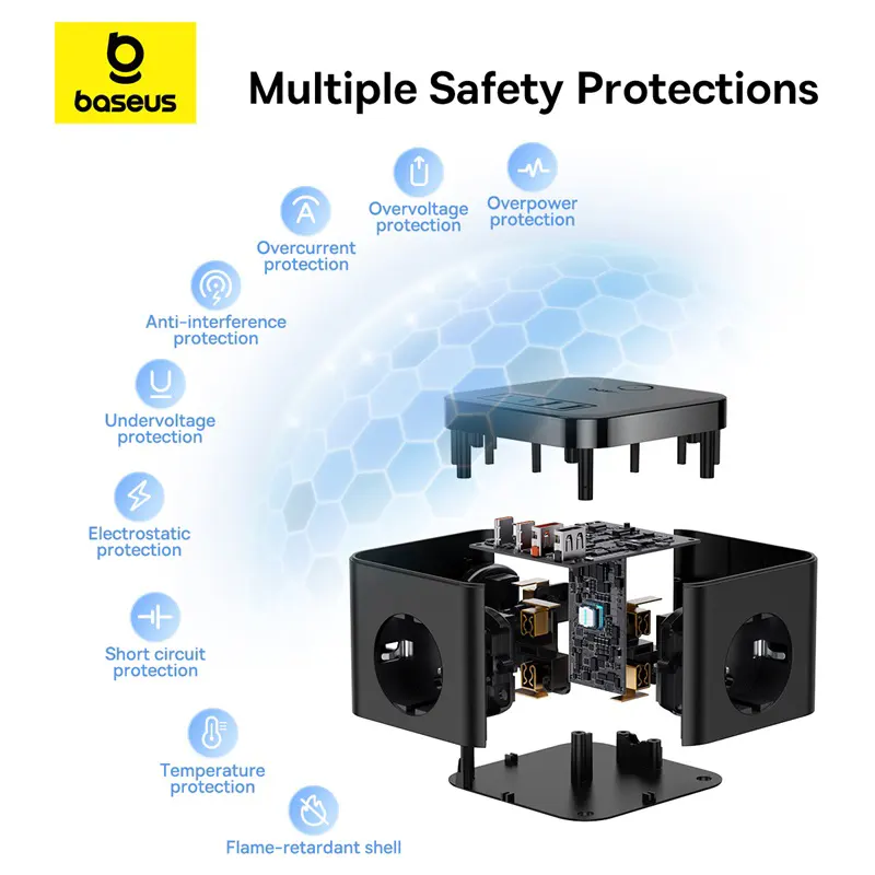 ایمنی دستگاههای الکترونیکی یکی از مهمترین مسائلی است که در هنگام خرید یک چندراهی برق به آن توجه میشود. خوشبختانه، آداپتور بیسوس مدل BPS30-3E با بیش از 9 نوع حفاظت، اطمینان خاطر لازم را برای شما فراهم میآورد. این مکانیزمها شامل محافظت در برابر ولتاژ پایین، ولتاژ بالا، جریانه بالا، توان بیش از حد، اتصال کوتاه و دما هستند.