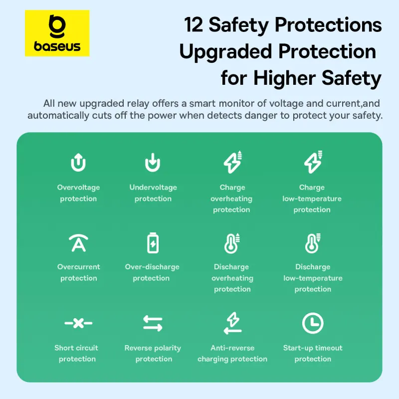 در یک دستگاه اضطراری که مستقیماً با باتری خودرو و جریانهای بالا سر و کار دارد، ایمنی یک اولویت مطلق است و Baseus این موضوع را جدی گرفته است. Baseus Primetrip Series 4-in-1 Jump Starter به 12 سامانه محافظتی هوشمند مجهز شده تا از شما، وسیله نقلیهتان و خود دستگاه محافظت کند؛ حتی در سختترین شرایط جادهای یا آبوهوایی.