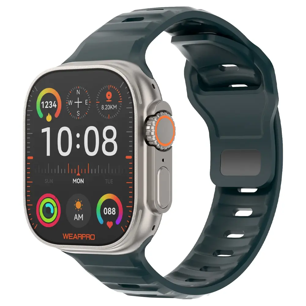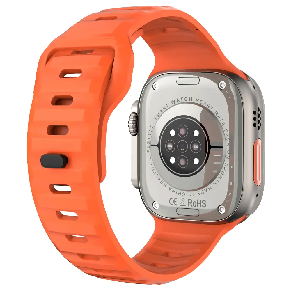 این ساعت با سایز فیزیکی 49 میلیمتری خود، ظاهری قدرتمند و اسپرت دارد که دقیقاً مطابق با استانداردهای طراحی مدلهای "اولترا" در بازار است. این ابعاد بزرگ، فضای لازم برای جایگذاری یک صفحه نمایش بینظیر 2.06 اینچی AMOLED HD را فراهم کرده است. رزولوشن 410×502 این نمایشگر تضمین میکند که تمام جزئیات محتوا، نقشهها و نوتیفیکیشنها با وضوح و روشنایی عالی مشاهده شوند. طراحی ارگونومیک بدنه 49 میلیمتری، در کنار بند سیلیکونی 22 میلیمتری، برای مچهای بزرگ و استفادههای سنگین ورزشی بسیار مناسب است.
