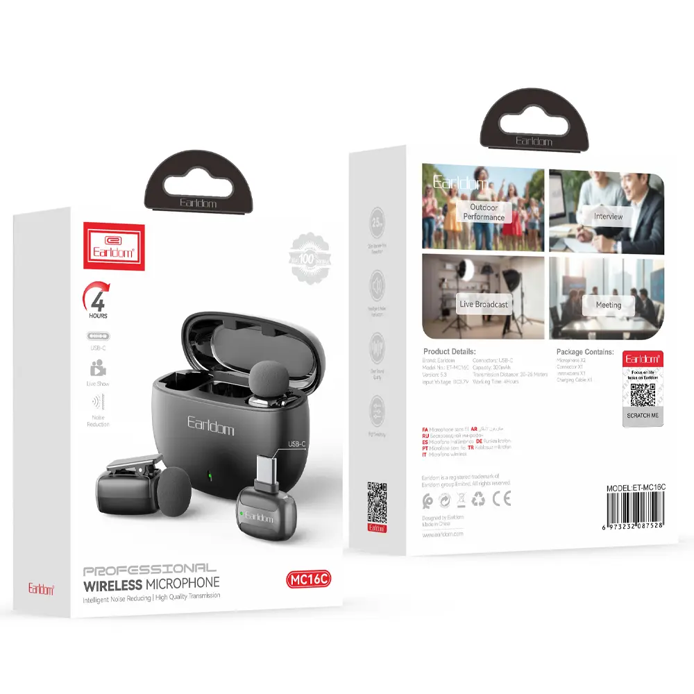 مهندسی اتصال در MC16C بر پایه سادگی و کارایی بنا شده است. به لطف سیستم Plug & Play، گیرنده بلافاصله پس از اتصال به درگاه USB-C توسط دستگاه شناسایی شده و فرآیند Auto-pairing بدون نیاز به نصب هیچگونه اپلیکیشن اضافی انجام میشود. این میکروفون با طیف وسیعی از دستگاهها شامل گوشیهای اندرویدی، تبلتها و لپتاپهای دارای رابط تایپ سی (Widely compatible) سازگار است. همچنین محتویات کامل بسته شامل دو میکروفون، گیرنده، کابل شارژ و دفترچه راهنما، شما را از خرید هرگونه لوازم جانبی اضافه بینیاز میکند. ⚡