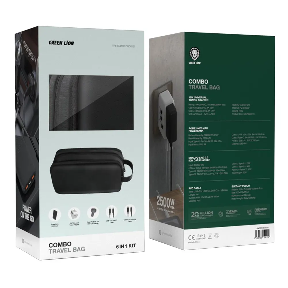 کیف مسافرتی ۶ در ۱ گرین لاین یک راهکار مهندسیشده و جامع شامل یک کیف ارگانایزر لوکس از جنس پلیاستر ۶۰۰D، یک پاوربانک ۱۰ هزار میلیآمپر ساعتی با توان خروجی بالا، شارژر فندکی قدرتمند ۵۰ وات با پورتهای Dual PD، آداپتور جهانی ۱۲ وات برای سازگاری با پریزهای بینالمللی و دو عدد کابل شارژ سریع (تایپسی و لایتنینگ) است. ویژگی رقابتی این کیت، یکپارچگی کامل میان توان خروجی شارژرها و ظرفیت کابلهاست که علاوه بر نظمدهی حرفهای به اکسسوریها، تضمین میکند که تمامی گجتهای شما در هر شرایطی با بالاترین استاندارد ایمنی و سرعت شارژ شوند. ⚡