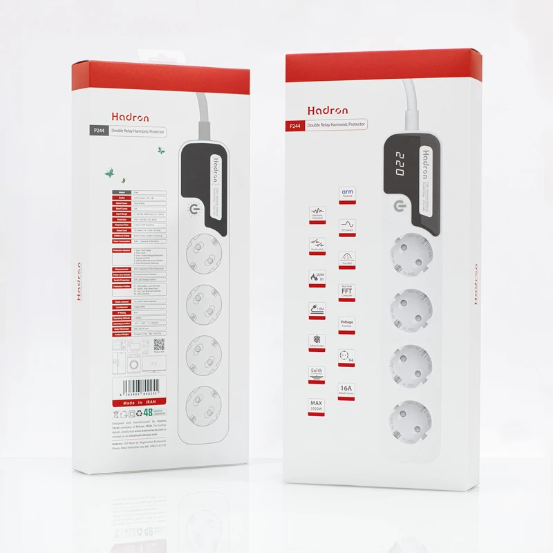 هادرون P244 چندراهی برق و محافظ هارمونیک دو رله، دستگاهی به منظور محافظت از لوازم و تجهیزات الکتریکی در برابر شرایط نامطلوب برق شهری است که از لوازم برقی در برابر افزایش ناگهانی هارمونیکهای مخرب، تغییرات ولتاژ و نوسانات فرکانس محافظت میکند. نمایشگر این محصول، امکان نظارت بر عملکرد دستگاه و همچنین مشاهده پارامترهای الکتریکی اندازهگیری شده از برق ورودی را فراهم میآورد. این دستگاه دارای چند برنامه محافظتی پیشفرض برای کاربردهای متفاوت است. کاربر میتواند متناسب با شرایط استفاده، اقدام به انتخاب برنامه مورد نیاز نماید. در فرآیند پایش برق شهری، علاوه بر پارامترهایی مانند ولتاژ و فرکانس، عامل مخاطرهآمیز و کمتر شناخته شدهای با عنوان «اعوجاج هارمونیک کل» یا THD وجود دارد. سطوح بالای THD، به صورت بالقوه، میتواند باعث آسیب جدی و یا اختلال در عملکرد وسایل برقی شود. با این حال، اندازهگیری این مؤلفه به پردازندهای قدرتمند نیاز دارد تا محاسبات دقیق ریاضی و پردازش اطلاعات را به صورت همزمان انجام دهد.