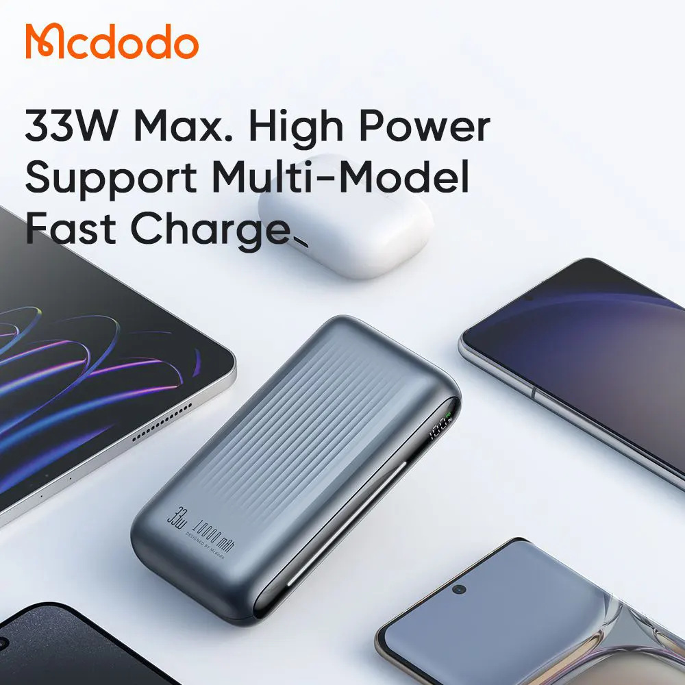 پاور بانک قابل حمل مک دودو مجهز به انواع فناوریهای شارژ سریع PD, PPS, SCP, FCP, AFC, SFC, QC3.0 و غیره است که امکان شارژ در کوتاهترین زمان ممکن را برای شما به ارمغان میآورد. پورت Type-C با حداکثر توان خروجی 33 وات به شما این امکان را میدهد تا در 30 دقیقه، بتوانید گوشیهای آیفون و سامسونگ S20 را تا %60 به سرعت شارژ کنید و همچنین پورت USB-A به شما این امکان را میدهد تا در 30 دقیقه، بتوانید هوآوی P40 را تا %64 به سرعت شارژ نمایید. باتری این دستگاه از نوع لیتیوم پلیمری با ظرفیت اسمی 10000 میلی آمپرساعت است که توانایی فول شارژ iPhone 13 mini تا 2.2 بار، شیائومی 13 تا 1.2 مرتبه، سامسونگ S21 تا 1.4 بار، هوآوی P40 تا 1.4 مرتبه و... را دارد.