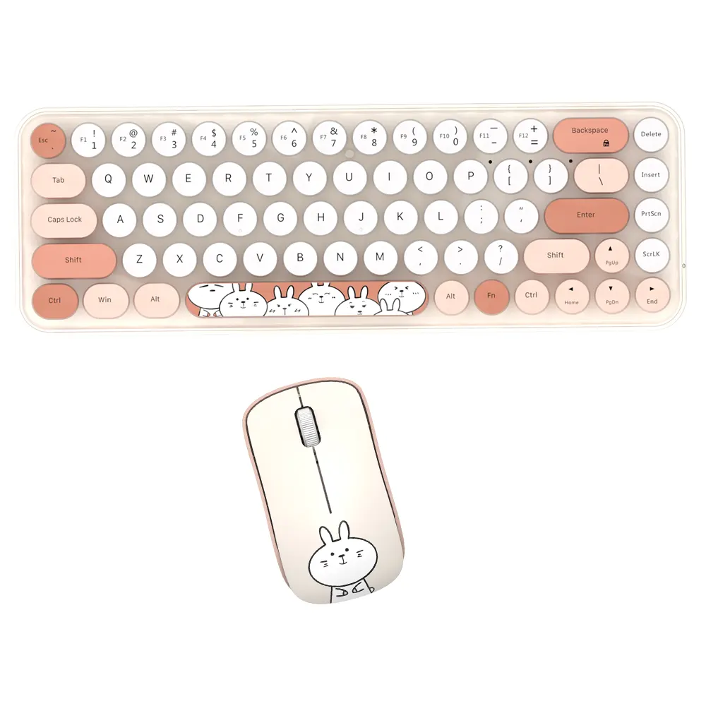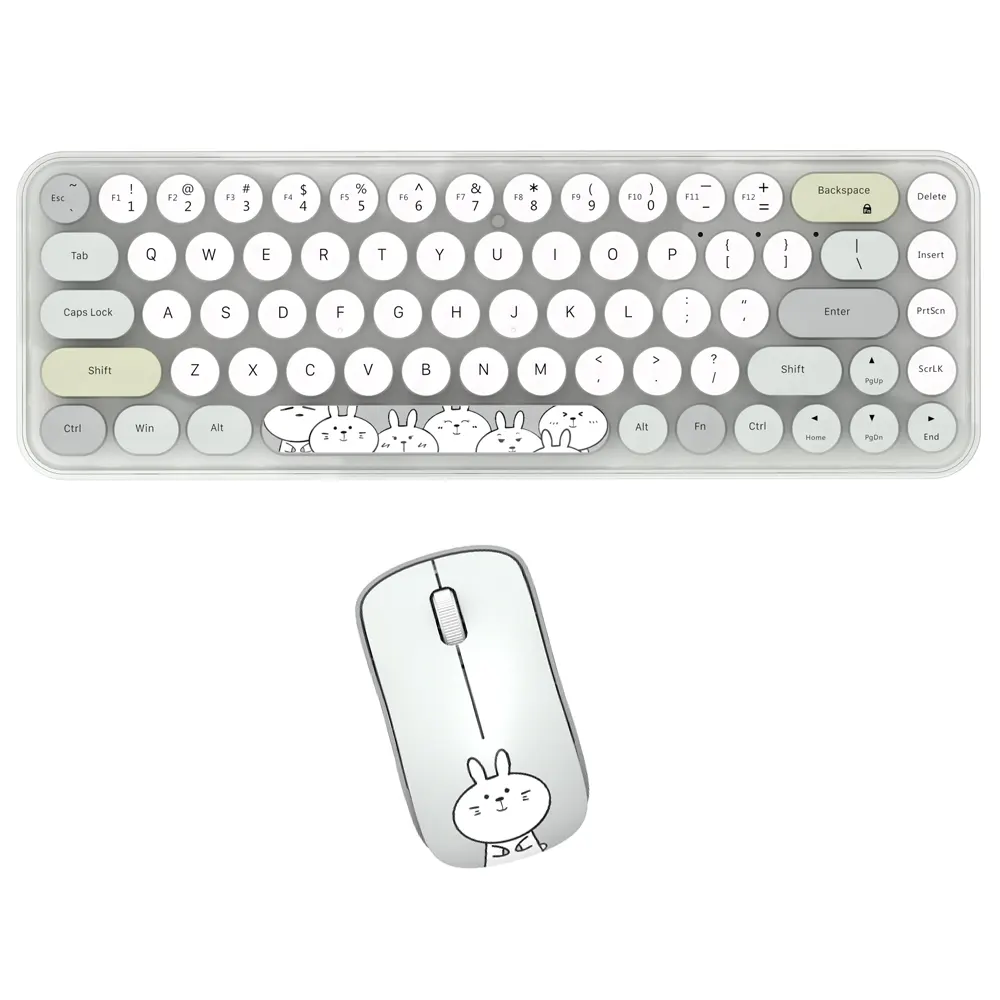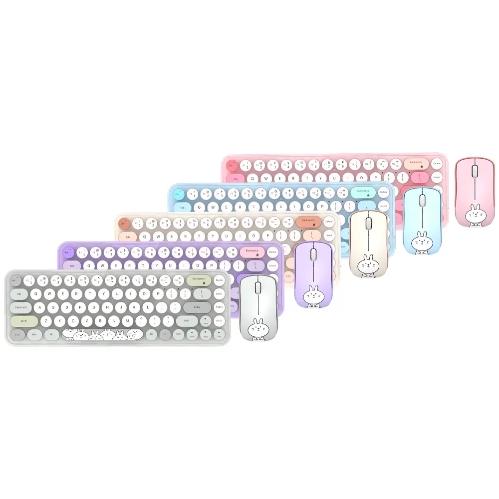 کیبورد و ماوس بیسیم مافی مدل I bean pro، سوییچ ممبران دارای کلیدهای گرد است. این سبک طراحی، حس نوستالژی ماشین تحریر را تداعی میکند و همزمان با رنگبندی پاستلی جذاب، فضایی شیرین و سرگرمکننده به میز کار میدهد. ابعاد 35×108×317 میلیمتر و وزن 400 گرم، نشان میدهد با وجود فرم Tenkeyless (بدون نامپد عددی)، کیبورد همچنان احساس محکمی دارد. جنس بدنه از پلیکربنات است که ضمن مقاومت مناسب، جلوهای باکیفیت به محصول میبخشد. پایههای قابل تنظیم و ضد لغزش در بخش زیرین کیبورد تعبیه شده است تا کاربر زاویه دلخواه را در حین تایپ انتخاب کند. ماوس همراه این ست نیز با ابعاد 33×55×96 میلیمتر و وزن 72 گرم، کاملا با اندازه دست اکثر کاربران سازگار است. حسگر اپتیکال و طرح خرگوش سفید بامزه روی بدنه ماوس، بار دیگر بر جذابیت ظاهری مجموعه میافزاید و آن را به گزینهای محبوب برای علاقهمندان به المانهای فانتزی تبدیل میکند.
