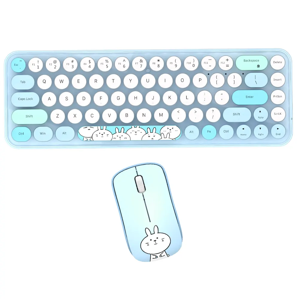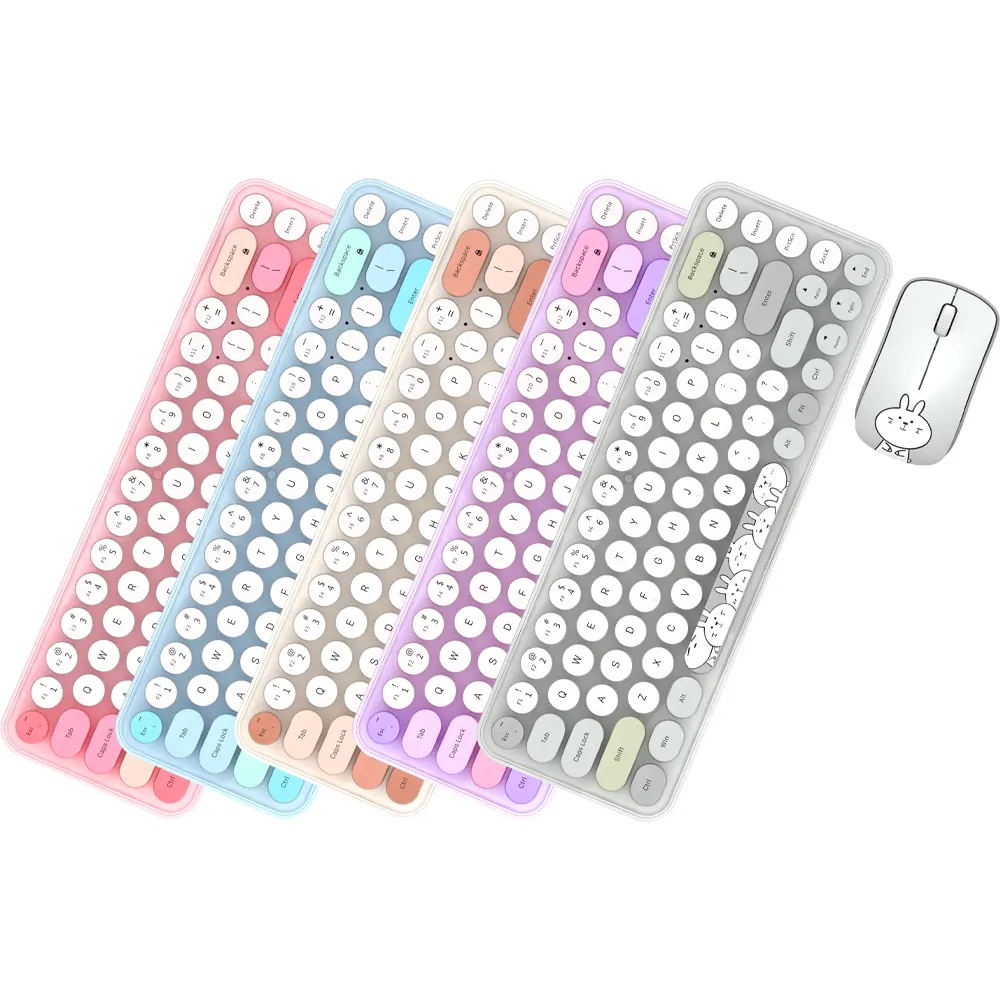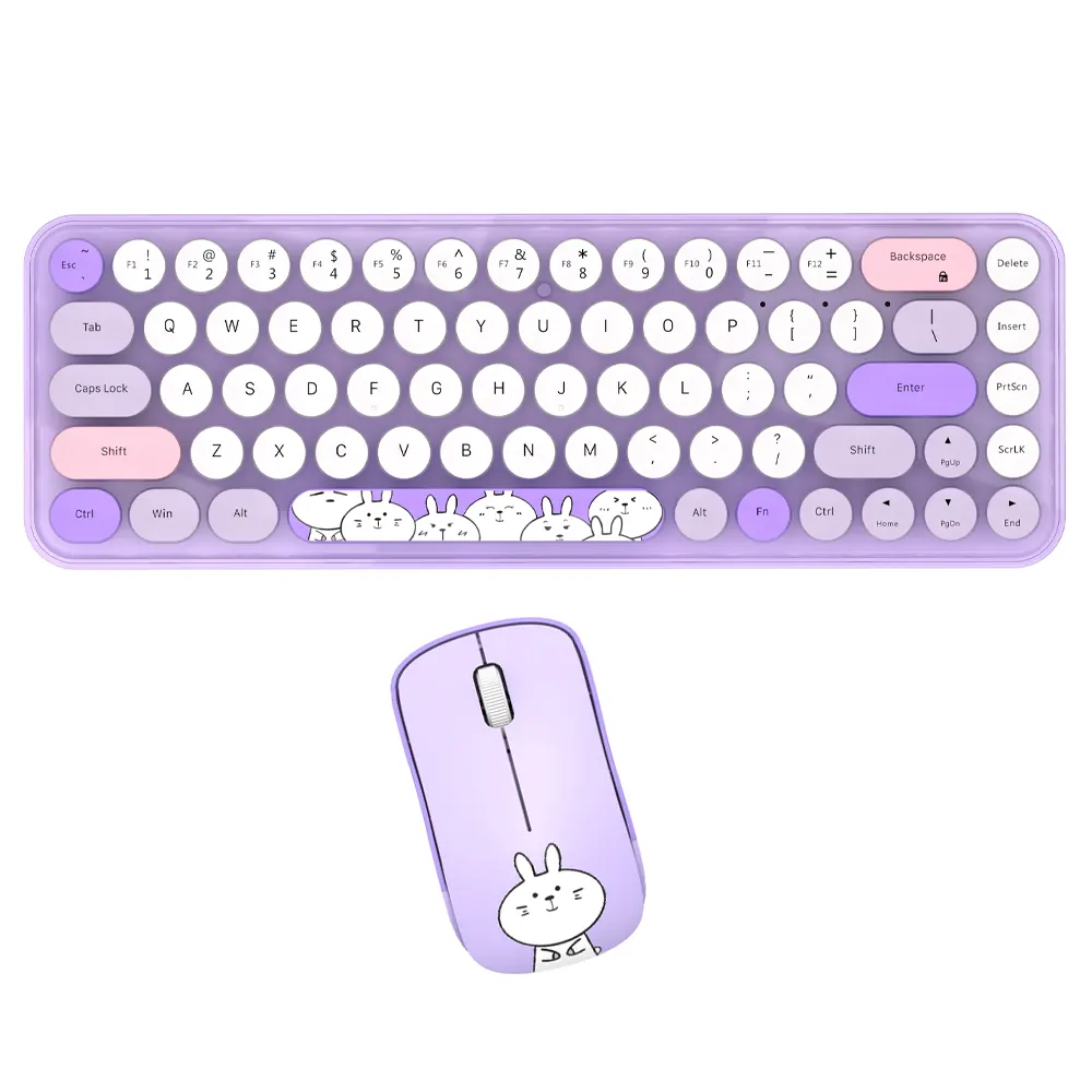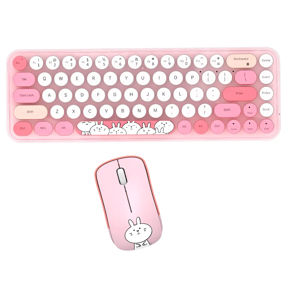 کیبورد و ماوس بیسیم مافی مدل I bean pro، سوییچ ممبران دارای کلیدهای گرد است. این سبک طراحی، حس نوستالژی ماشین تحریر را تداعی میکند و همزمان با رنگبندی پاستلی جذاب، فضایی شیرین و سرگرمکننده به میز کار میدهد. ابعاد 35×108×317 میلیمتر و وزن 400 گرم، نشان میدهد با وجود فرم Tenkeyless (بدون نامپد عددی)، کیبورد همچنان احساس محکمی دارد. جنس بدنه از پلیکربنات است که ضمن مقاومت مناسب، جلوهای باکیفیت به محصول میبخشد. پایههای قابل تنظیم و ضد لغزش در بخش زیرین کیبورد تعبیه شده است تا کاربر زاویه دلخواه را در حین تایپ انتخاب کند. ماوس همراه این ست نیز با ابعاد 33×55×96 میلیمتر و وزن 72 گرم، کاملا با اندازه دست اکثر کاربران سازگار است. حسگر اپتیکال و طرح خرگوش سفید بامزه روی بدنه ماوس، بار دیگر بر جذابیت ظاهری مجموعه میافزاید و آن را به گزینهای محبوب برای علاقهمندان به المانهای فانتزی تبدیل میکند.