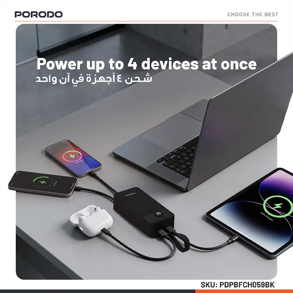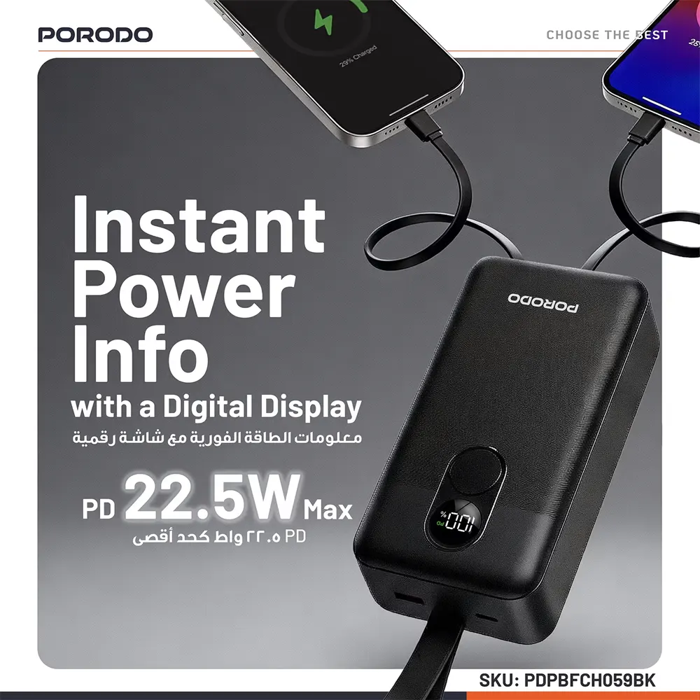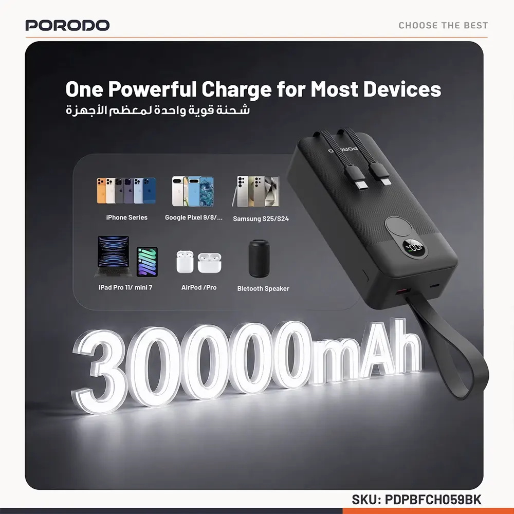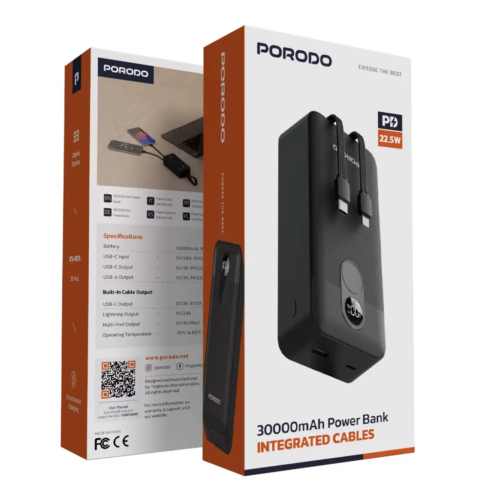 Porodo 30000mAh Digital Display with C & Lightning Cable PDPBFCH059BK
