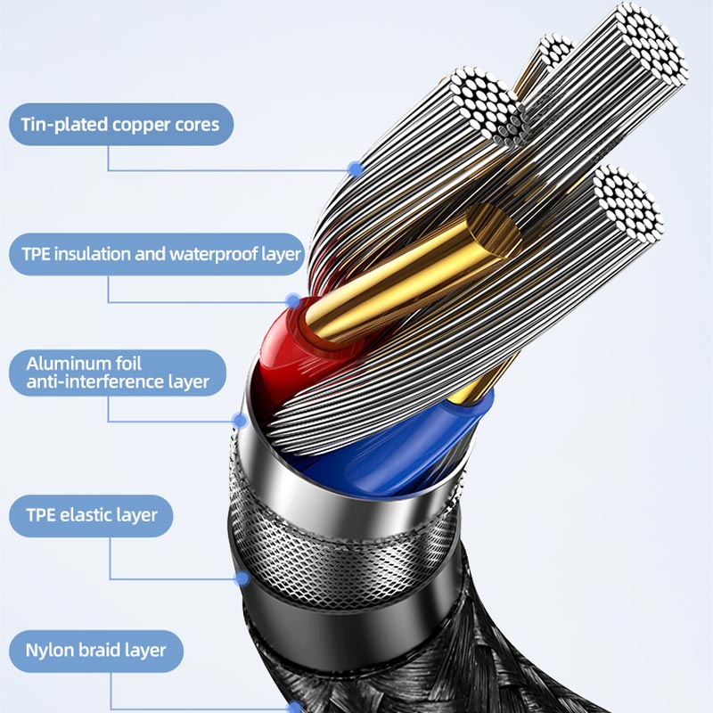 از اینها گذشته، خوب است کمی هم جزئیات و کیفیت ساخت کابل شارژ و دیتای US-SJ581 یوسامز را از نظر بگذرانیم. ساختمان درونی این محصول شامل رشتهسیمهای ضخیم قلعاندودی میشود که با دو لایه TPE ضدآب و کشسان و یک لایه ورق آلومینیومی پوشانده شدهاند تا هم اتلاف انرژی کمتر و سرعت انتقال الکتریسیتهی بیشتری را شاهد باشیم و هم احتمال صدمه دیدن این ساختار درونی به صفر نزدیک شود. به دور این رشتهسیمها و لایههای محافظشان روکشی از جنس نایلون بافتهشده کشیدهاند که ضدگره است و بههیچوجه بههمریخته نمیشود. برچسبی که به این کابل اضافه کردهاند تا جمعوجور کردن آن آسان شود نیز مزید بر علت است.
