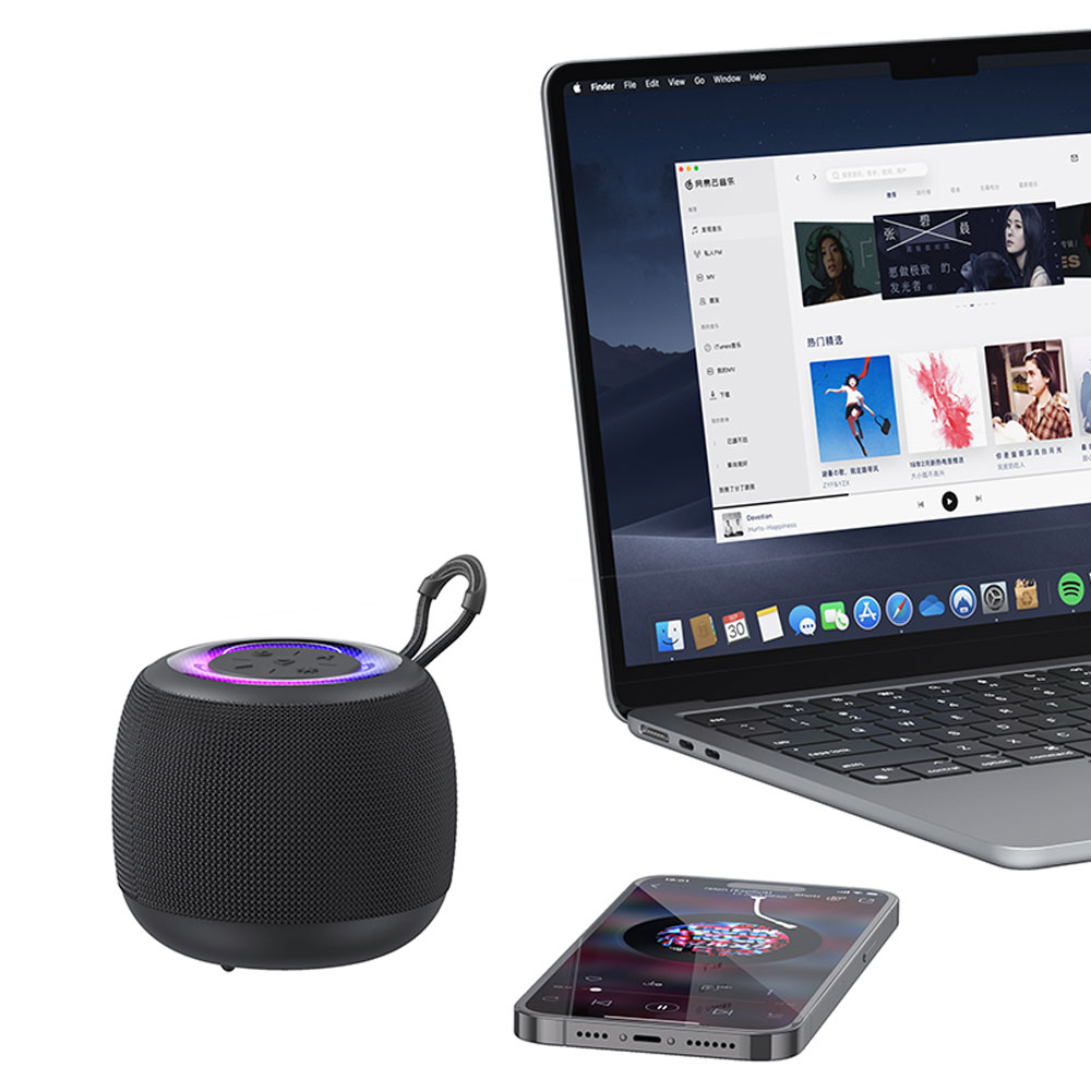 - طراحی زیبا: با طراحی کوچک و نورپردازی RGB، این اسپیکر به یک اکسسوری شیک تبدیل شده است.